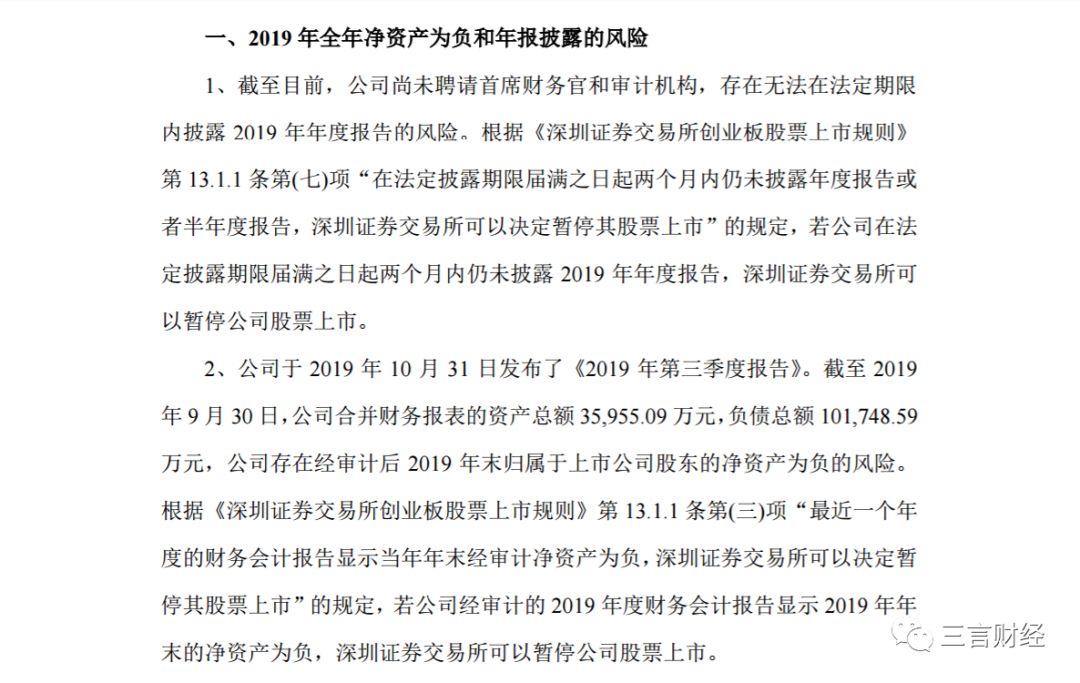 二,若公司审计的2019年度财务会计报告显示2019年年末的净资产为负,深圳证券交易所可能暂停公司股票上市;