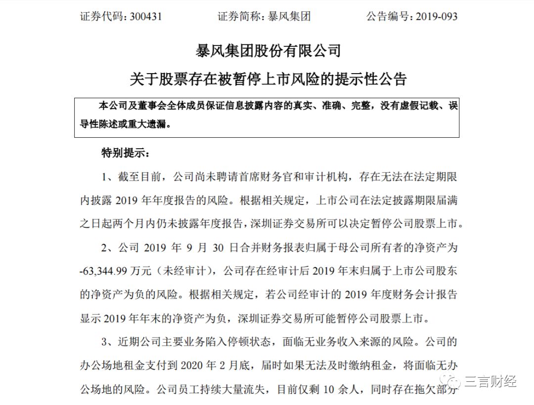 11月19日,暴风集团发布关于股票存在被暂停上市风险的提示性公告称,公司2019年9月30日合并财务报表归属于母公司所有者的净资产为-63,344.99万元(未经审计),公司存在经审计后2019年末归属于上市公司股东的净资产为负的风险。根据相关规定,若公司经审计的2019年度财务会计报告显示2019年年末的净资产为负,深圳证券交易所可能暂停公司股票上市。