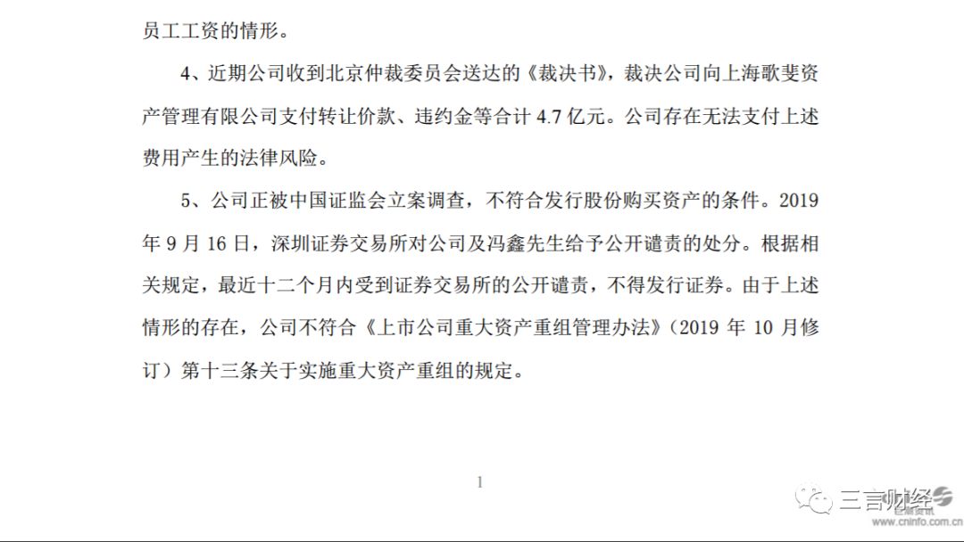 五,公司正被中国证监会立案调查,不符合发行股份购买资产的条件。2019年 9 月 16 日,深圳证券交易所对公司及冯鑫先生给予公开谴责的处分。根据相关规定,最近十二个月内受到证券交易所的公开谴责,不得发行证券。由于上述情形的存在,公司不符合《上市公司重大资产重组管理办法》(2019 年 10 月修订)第十三条关于实施重大资产重组的规定。