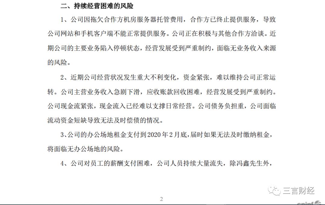 三,近期公司陷入停顿状态,面临无业务收入来源风险。办公场地租金如果无法及时缴纳,将面临无场地办公风险。公司员工大量流失,仅剩10人,同时存在拖欠部分员工工资的事实;