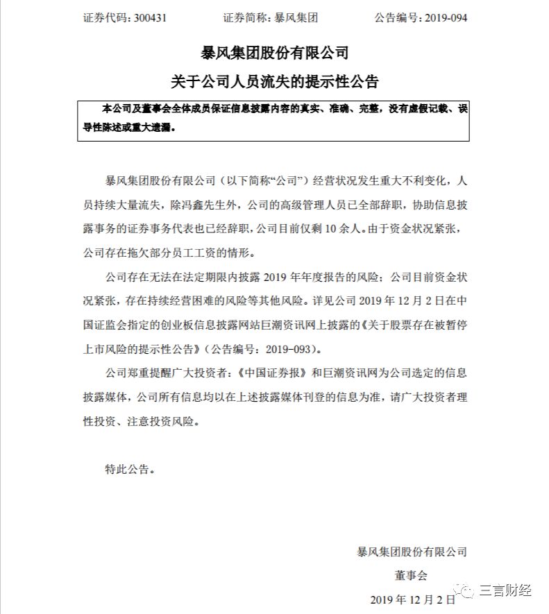 今日,暴风集团(300431.SZ)公告称,除冯鑫外,公司的高级管理人员已全部辞职,协助信息披露事务的证券事务代表也已经辞职,公司目前仅剩10余人。由于资金状况紧张,公司存在拖欠部分员工工资的情形。