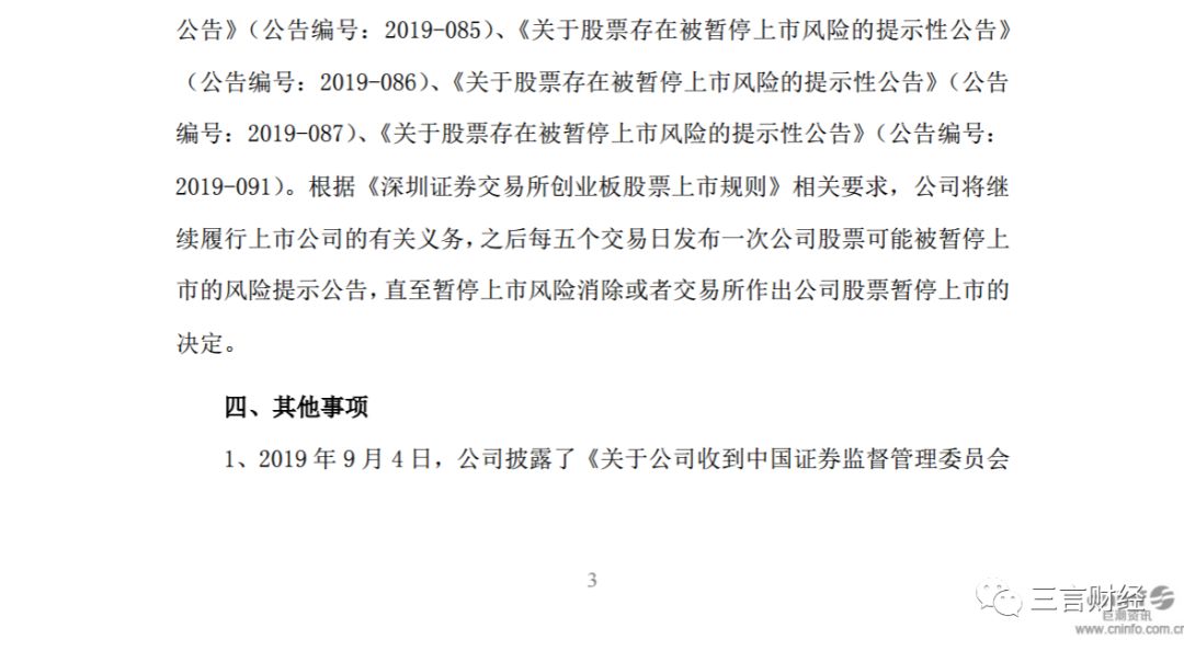 在一同发布的另一份公告,关于股票存在被暂停上市风险的提示性公告显示: