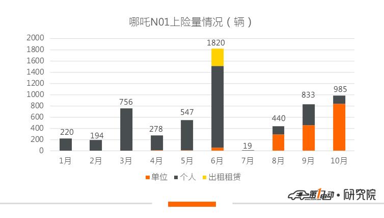 哪吒N01在前5月的交付情况一直不温不火,6月赶着最后一波补贴红利直接将上险量拉升至1820辆,但提前透支的消费行为也让7月的上险量直接跌至两位数水平,创下2019年1-10月交付单月新低。随后的三个月,通过大客户的拉动,哪吒N01的交付量逐渐回升,稳定住了其准第一梯队的位置。