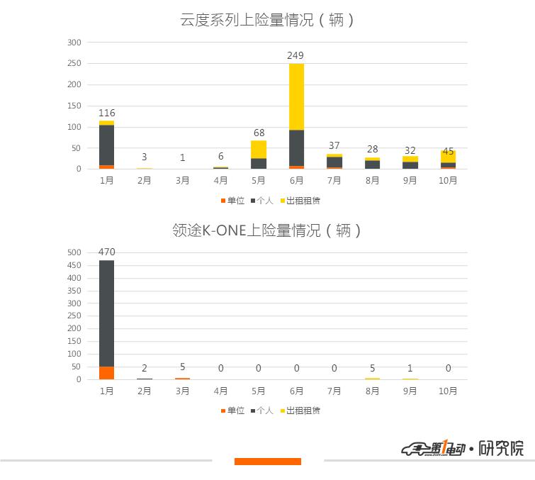 同为小型SUV车型的领途K-ONE和云度系列,分别在今年前10个月拿下483和585辆上险成绩,但具体到单月来看,两个品牌的情况大相径庭。