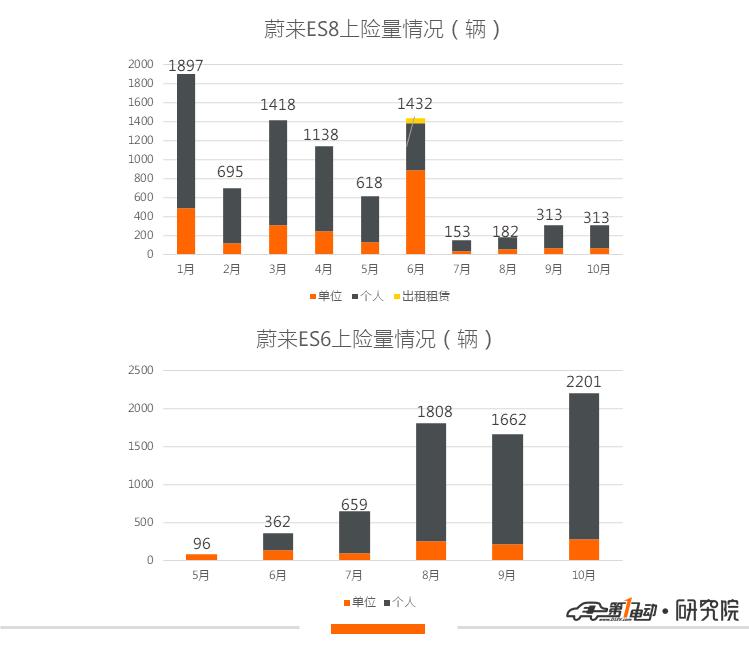 蔚来作为第一梯队里唯一一家有两款车型销售的新势力,上险数目前排名国内新势力第一。ES8在1-10月共上险8159辆,其中个人用户上险5686辆,单位上险2423辆,出租租赁上险50辆。