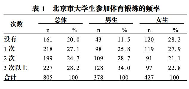 在《北京市大学生体育锻炼态度和行为的调查研究》中,面向北京大学、北京师范大学、北京邮电大学等6所高校的问卷调查发现,有80%学生每周至少参加1次体育锻炼 ,其中每周3次以上的占总人数的28.2%。