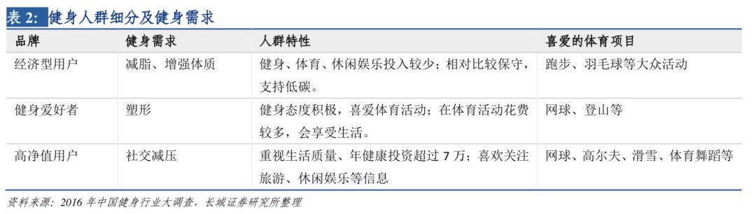 根据长江证券《2016年中国健身行业大调查》 中,将健身人群以及具体需求分为,希望「减脂、塑形」的健身爱好者、经济型用户,以及有社交减压需求的高净值用户群。