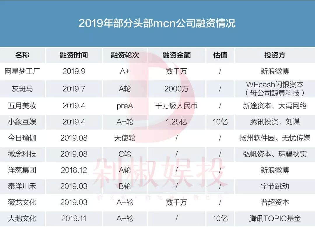 一方面是因为,在投资界对MCN机构是否有投资价值,仍有不小争议;另一方面,MCN一般有良好的现金流,因此,股权融资的意愿不大。
