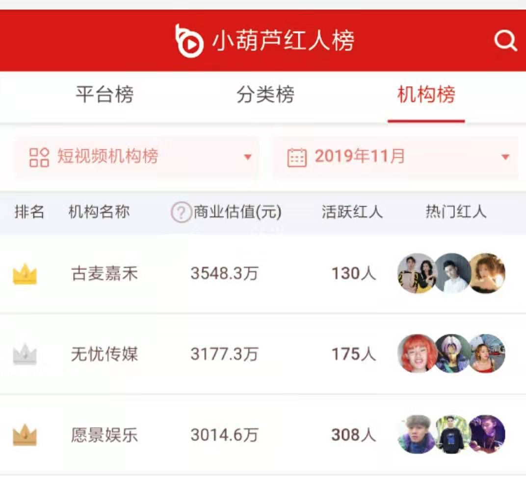 最近,第三方数据公司小葫芦公布了今年11月MCN商业估值排名榜单,其中,古麦嘉禾以3548万估值排名第一,无忧传媒以3177万估值排名第二,愿景娱乐以3014万估值排名第三……