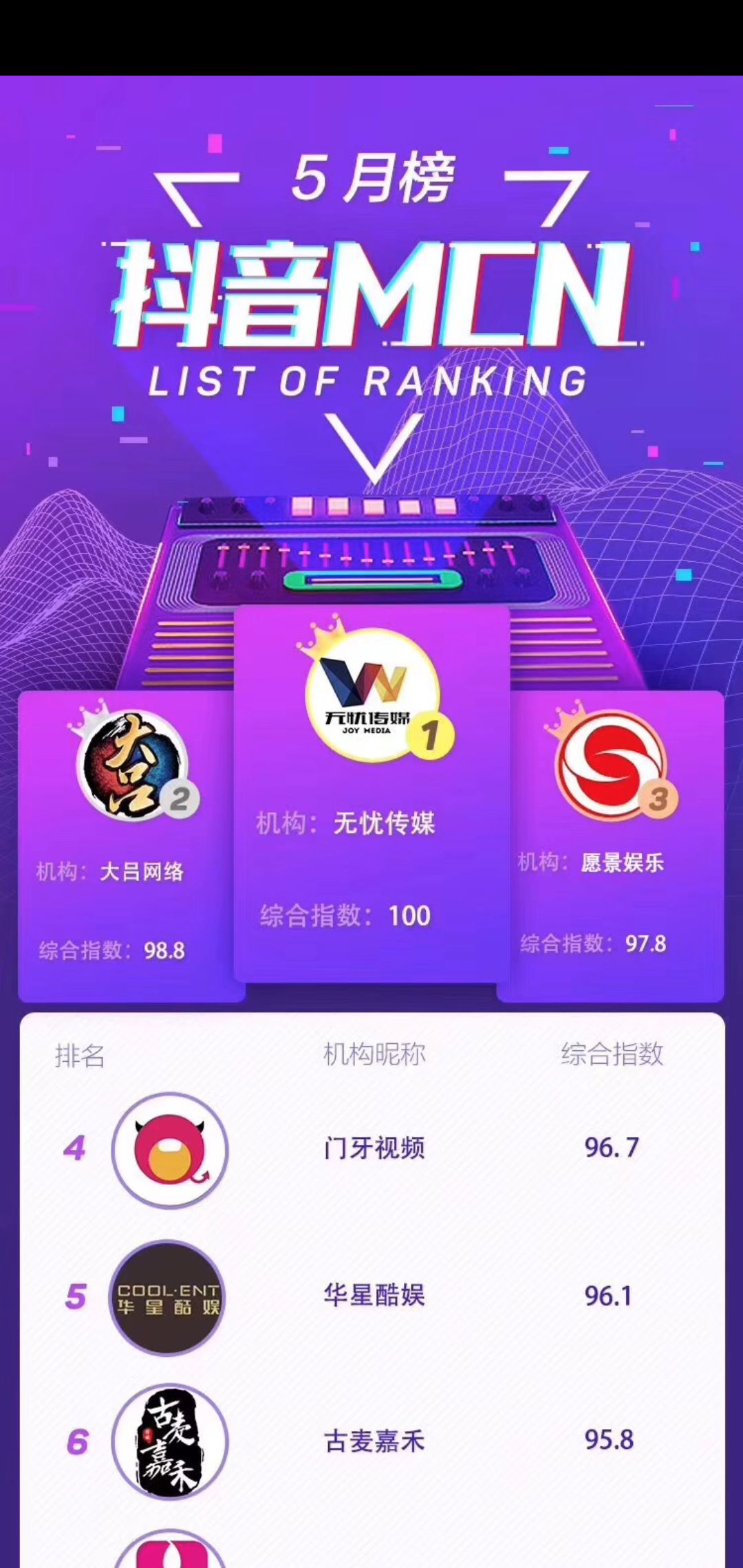 观察抖音每月排名榜可以发现,抖音榜单上排名前几位的MCN机构,都是以前做直播的工会。从横向上说,MCN机构变得越来越集短视频、秀场、电商直播与一体,更加多元化发展。