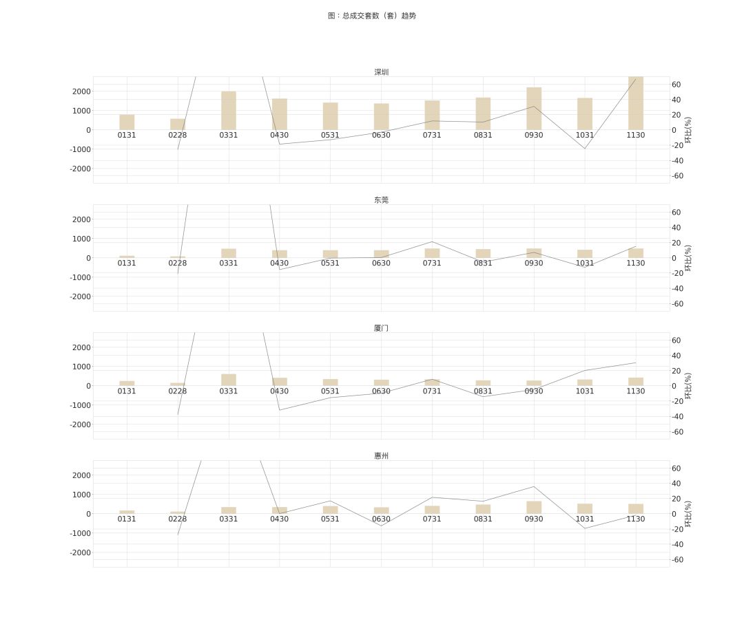 从数据上看,深圳成交量最高,为 2765 套,另外,深圳成交量环比增长了 66.37%,而惠州市场成交量环比则有一定下滑。