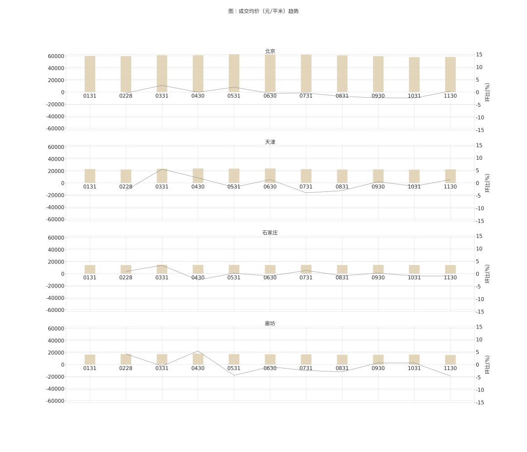 从成交价格来看,北京是环京城市中成交均价最高的城市,上月成交均价达到 58518元/平米,环比变化为 0.37%。天津成交均价环比上涨 1.3%,涨幅最大。