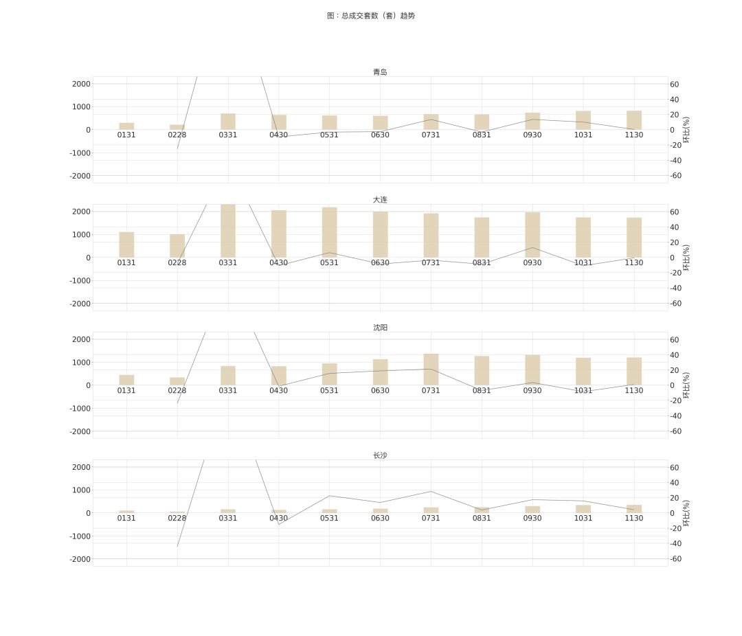 从数据上看,大连成交量最高,为1736套,另外,长沙成交量环比增长了4.05%,而大连市场成交量环比则有一定下滑。