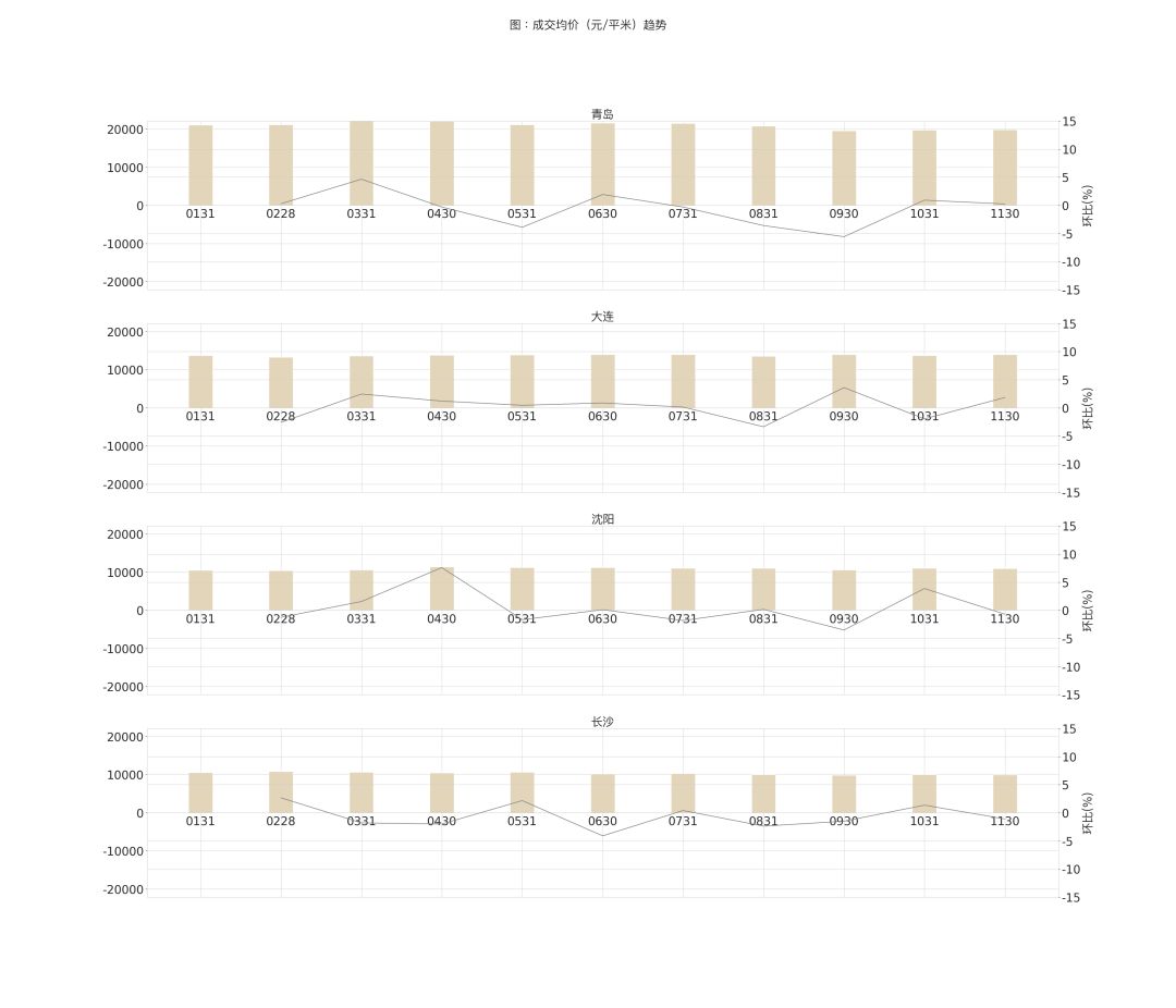 从成交价格来看,青岛是其他重点城市中成交均价最高的城市,上月成交均价达到19840元/平米,环比变化为0.24%。大连成交均价环比上涨1.83%,涨幅最大。