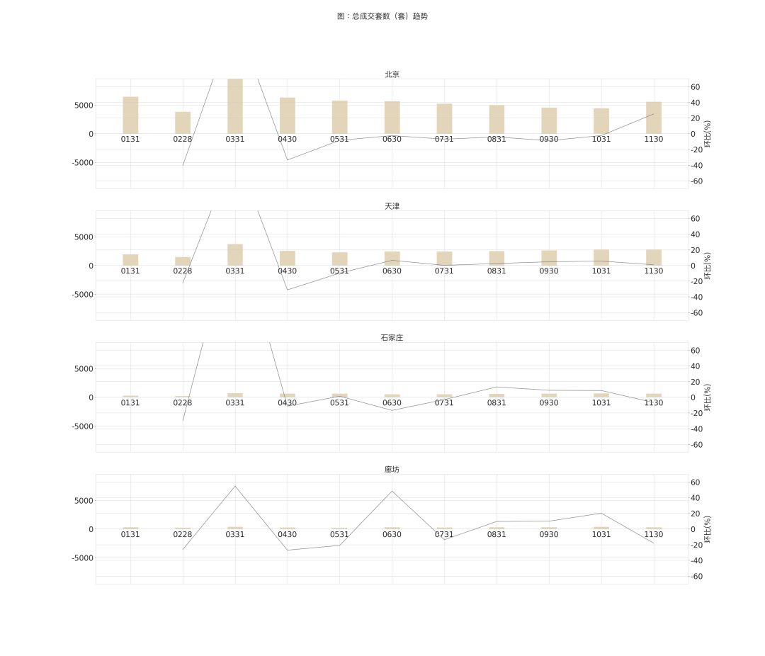 从数据上看,北京成交量最高,为 5597 套,另外,北京成交量环比增长了 25.13%,而石家庄, 廊坊市场成交量环比则有一定下滑。
