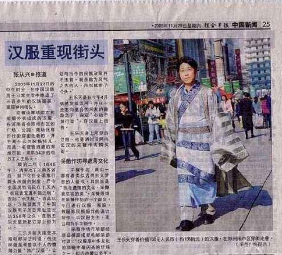 2003年11月22日,一个叫王乐天的电力工人身穿汉服走在郑州的街头。这是互联网上可以查到的中国第一个在公开场合穿汉服的人。当时王乐天所穿的汉服是他和工友手工缝制,在当时大众更多的是不理解和奇怪,甚至有人将之当做和服。时隔多年,这被视为中国汉服复兴运动的起点。