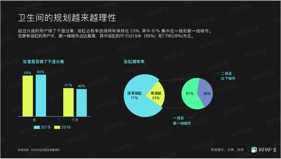 与此同时,超六成用户在卫生间做了干湿分离,这也反映都市人对卫生间的规划更趋理性。值得一提的是,浴缸占有率连续两年保持在23%,其中61%集中在新一线城市、一线城市。浴缸的尺寸以1.5米与1.7米的标准浴缸、大浴缸为主,而非迷你浴缸。不管房子大小,也要实现“浴缸自由”,代表都市人对生活品质的追求。