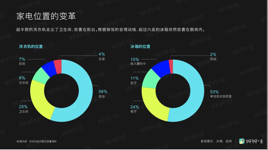 超半数的洗衣机走出卫生间、进到阳台,当属家电位置的最大变革。好好住App里,用户在阳台打造了各式洗衣区,比如洗衣收纳柜,以及集洗衣、晾晒、烘干、熨干于一体的洗衣房等。