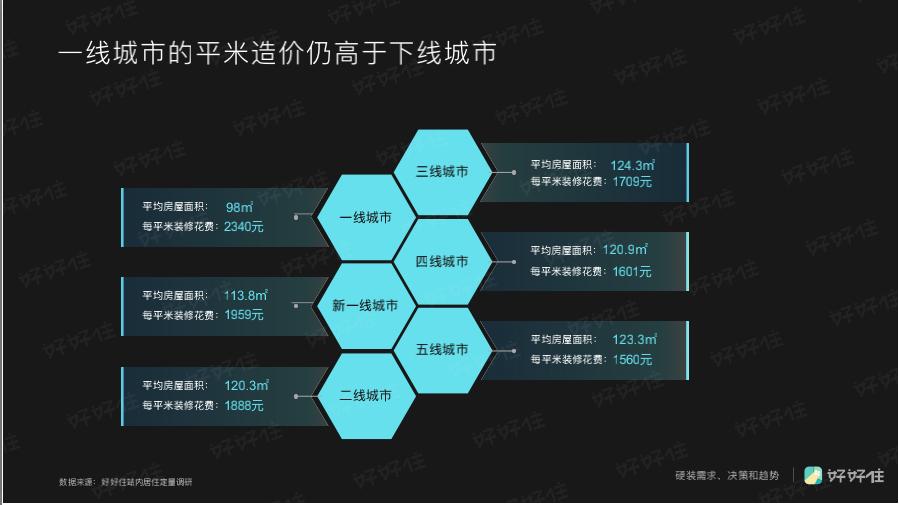 新一线、二线城市家装实际花费,已与一线城市基本持平,均在22万左右。三线及以下城市家装花费也在向一线城市靠拢。一线城市与五线城市的装修实际花费相差并不大,不超过5万。但由于一线城市平均房屋面积均比其他城市小,因此平米造价要高于其他城市。