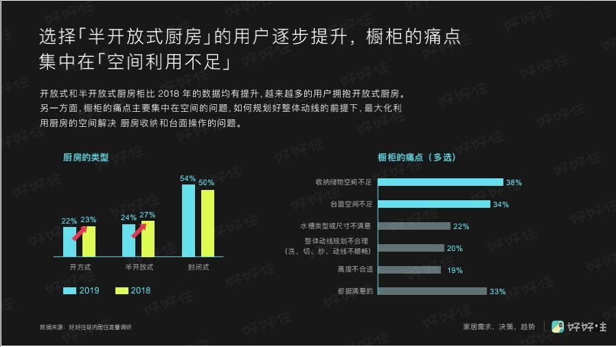 跟去年比,选择开放/半开放式厨房的用户进一步提升。如图,厨房橱柜的最大痛点为收纳储物空间不足,第二大痛点为台面空间不足。