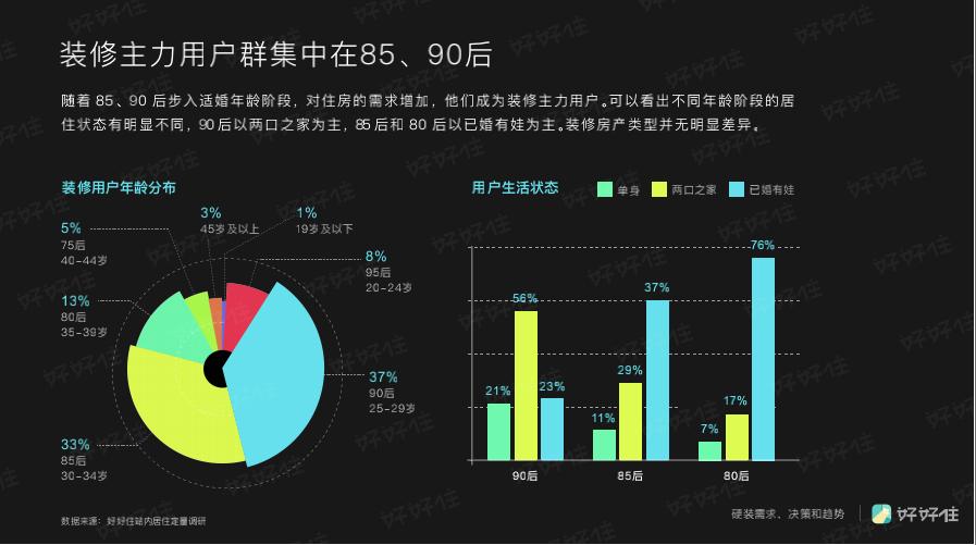 装修主力军集中在85、90后。随着85、90后逐渐步入适婚年龄,对住房需求大大增加,也成了家装消费主力军。相比上一代,面对居住,他们更愿为品质装修买单。