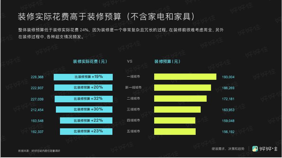 装修实际花费高出装修预算24%。正所谓“装修预算就是拿来超的”,纵观全国家装市场,消费者的装修实际花费平均高出装修预算24%。
