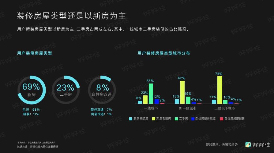 装修房屋类型以新房为主,半包为主要装修方式。就全国市场而言,装修房屋类型以新房为主。但目前,一线城市仍以二手房装修为主。