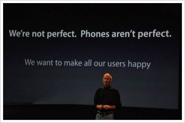 也就是说,在把同行都“拉下水”之后,乔布斯承认了“手机不完美”这一不争的事实;然后,又给出了“我们想让用户满意”的解决方案。