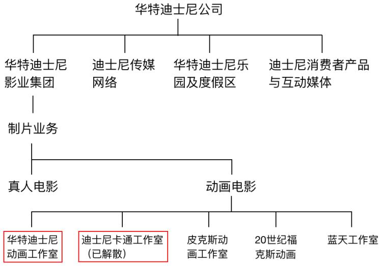 ▲华特迪士尼动画工作室及迪士尼卡通工作室在迪士尼公司的大致位置(PingWest品玩制图)