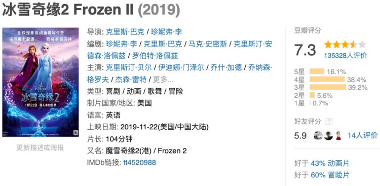 时隔六年,曾让无数小女孩幻想自己是冰雪女王、让无数大人感动不已的迪士尼动画电影《冰雪奇缘》终于有了续集。不过比起第一部8.3的豆瓣评分,《冰雪奇缘2》的7.3分怎么说都有点低。
