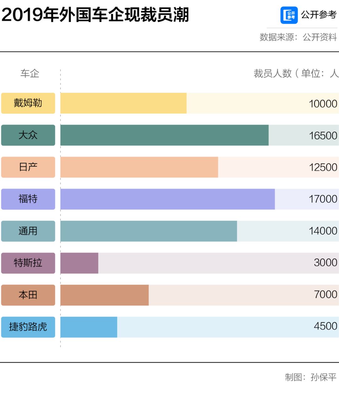 今年3月,欧洲最大的车企大众称计划在2023年前裁员5000-7000人。今年2月,美国最大的汽车制造商通用汽车宣布再次裁员4000人。今年1月,路透社报道称,韩国的现代汽车计划裁员。