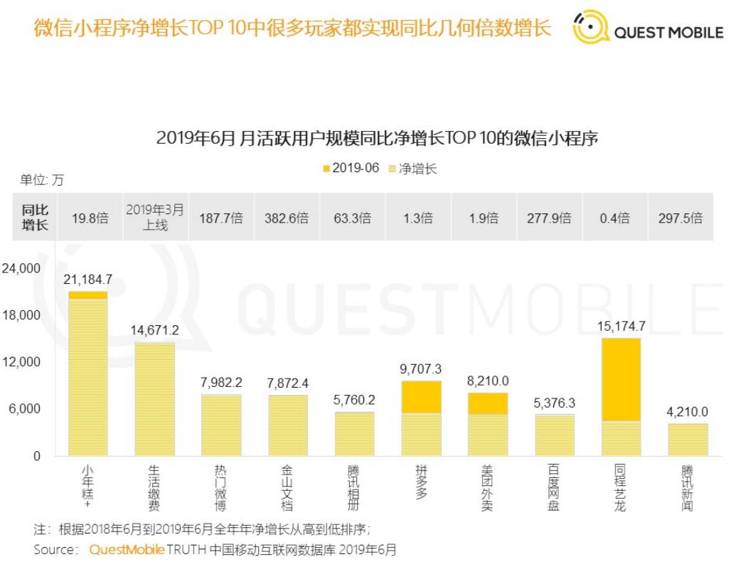 相比较普通app的打开应用商店、下载、安装、注册、登录的繁琐流程,微信小程序依赖微信原有的生态,将使用服务的门槛降到最低,更适合老年人。Questmobile报告显示,截至2019年6月,中老年社交小程序的头部选手小年糕+的月活跃用户同比增长19.8倍, 净增长21万。无论是净增长数或者是倍数,都远远超过同程艺龙、拼多多、美团外卖等巨头小程序。