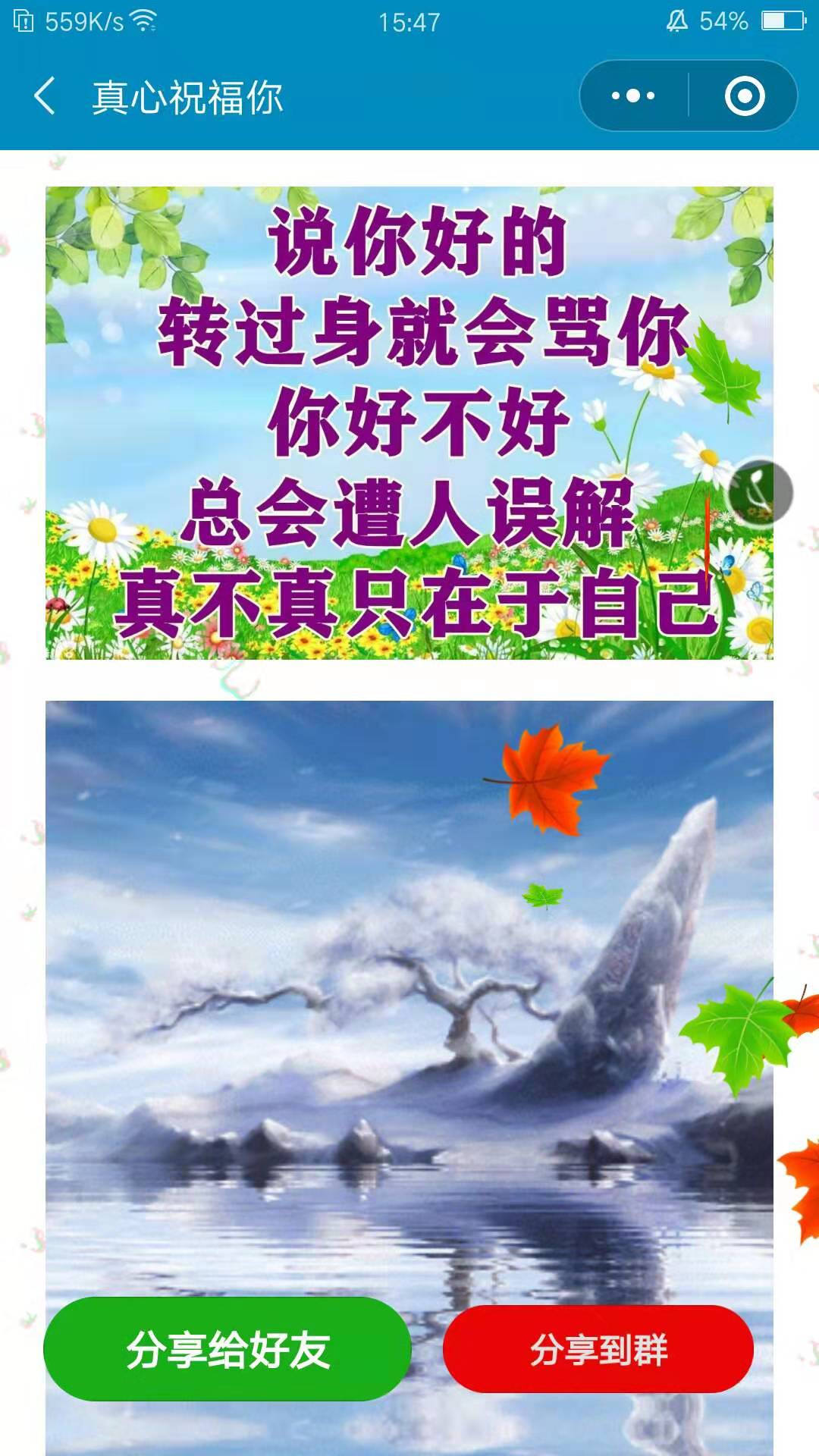 “微笑是一朵鲜花,永远对生活开放。”“说你好的,转过身就会骂你”“你好不好,总会遭人误解,真不真只在于你自己。”“人生别作恶,作恶只有天收” ……这一句句中老年人画风的生哲理警示名言来自于一款名为 “真心祝福你”的微信小程序。