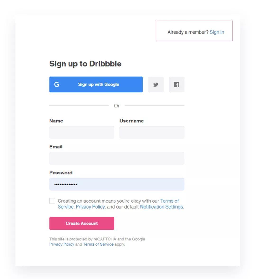 创建账户的按钮已dribbble的主题能很快突出在用户面前。新用户可以直接在页面上注册,而返回的用户可以使用最上面右上角的登录两字。看到上面“sign in ”字段了吗?