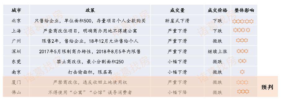 研究分析指出,最近出台政策的城市中,厦门由于政策较为严厉,违反可无偿收回土地使用权,预计对公寓的成交量影响较大。佛山对商办用地项目规划建设方面加以限制,不得建设公寓产品,销售过程中不得销售该类产品,不得误导消费者,并且要向购房者公示宣讲商办项目与住宅项目差异,并且明确提出商办类项目是商水商电、配套上不得落户上学等,预计将对市场产生较大冲击。
