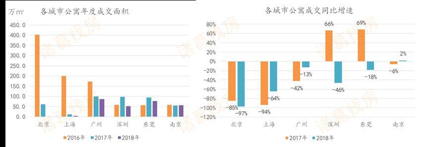 南京、东莞的公寓政策的影响较为温和,成交面积变化不是很大,尤其是南京,2017年、2018年商住公寓的成交面积同比下降分6%、2%。东莞于2017年10月出台政策,2018年商住公寓成交面积同比下降18%,整体影响力度不大,属于稳中趋降的局面。