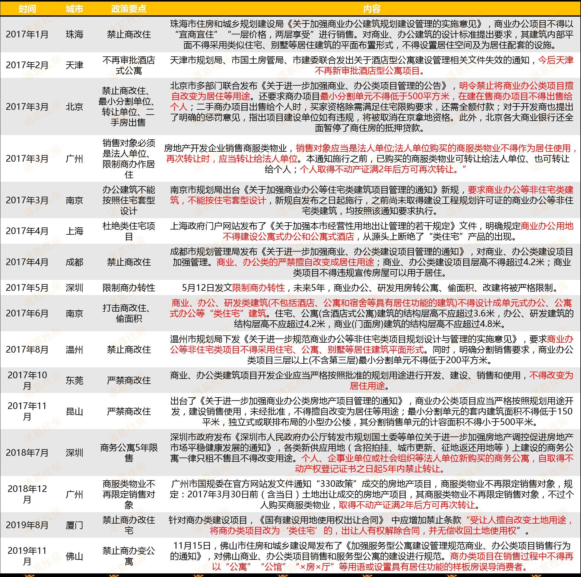 2017年以来各城市出台限制商改住政策一览