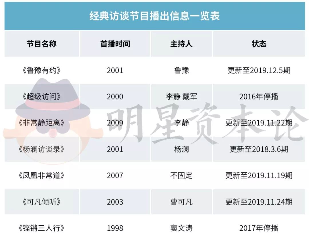《非常静距离》、《可凡倾听》如今依然维系着最原始的形态在卫视播出。明星资本论(id:mingxingzibenlun)在采访的过程中了解到,此类节目可以延续生命周期的原因在于,棚内录制的访谈节目成本相对较低,可以填补电视台的空档时间,且又不失档次,50岁以上的电视观众对此类节目也依然有需求。