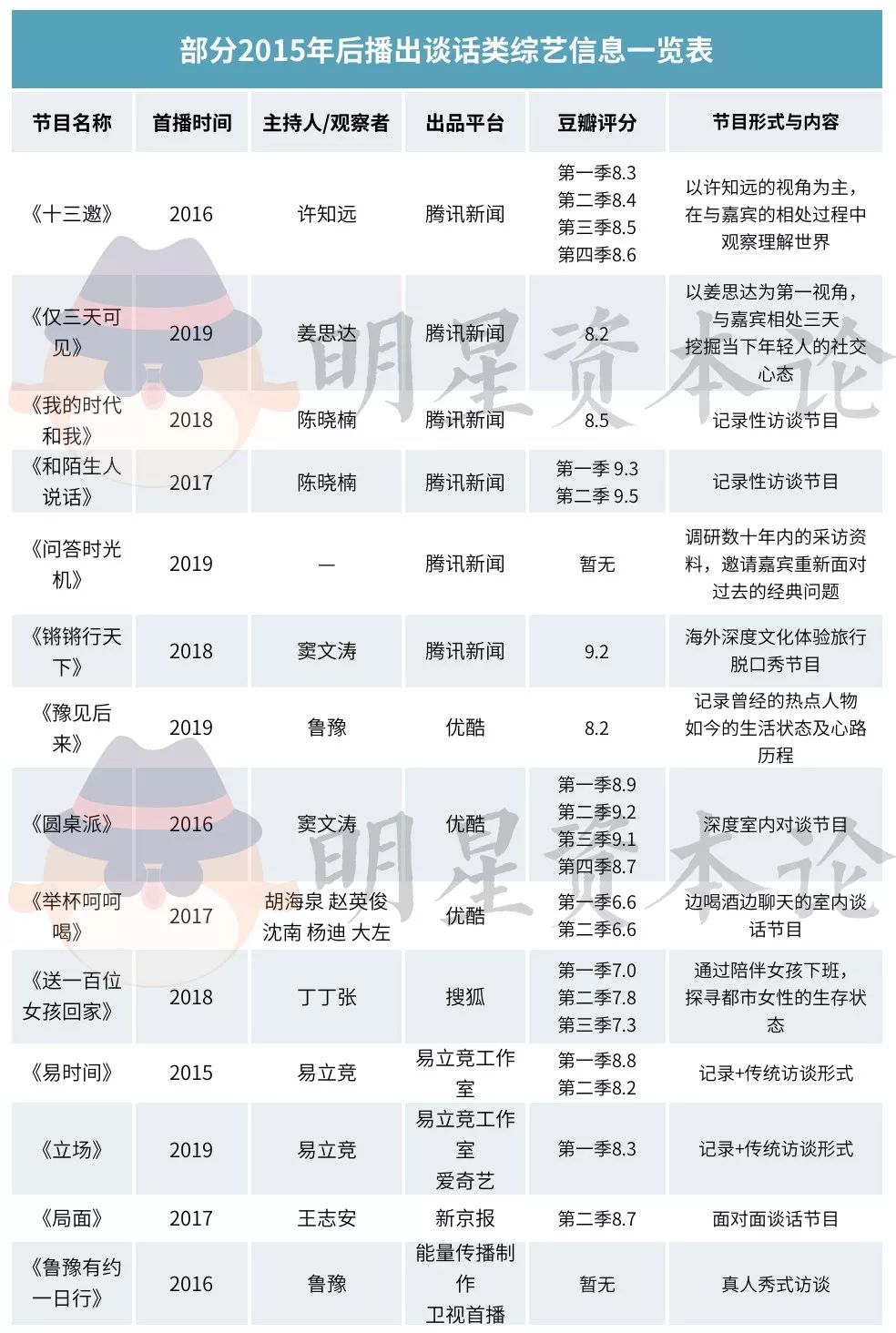 三年前,因《超级访问》、《铿锵三人行》宣告停播,访谈节目一度被唱衰。不少人认为在媒介渠道更迭、信息流爆炸及碎片化的时代,观众已经不再需要访谈节目。但在明星资本论(id:mingxingzibenlun)采访部分制作团队的过程中,则获得了一致的观点:正是因为娱乐内容井喷,观众审美垂直,市场上才更加需要有创新意识和价值的内容形态。