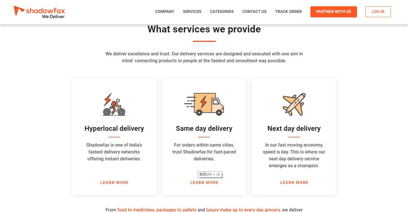 从外卖到药品,从打包到运输,从奢饰品到日常杂货,Shdowfax能提供一切。通过Sadowfax,配送员能够最省时和最低成本的运送货物,客户则能享受到最优质的物流服务。