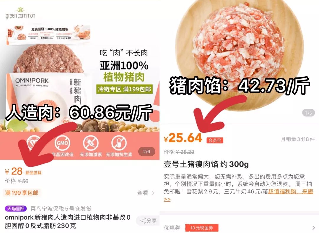 换算一下,人造肉的售价是一斤60.86元,而真猪肉的价格是42.73元。作为新兴事物的人造肉,身价自然也是水涨船高,这「假的」竟然比真的还贵了。