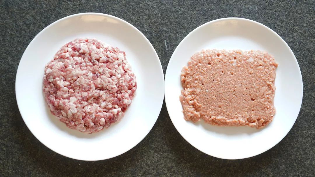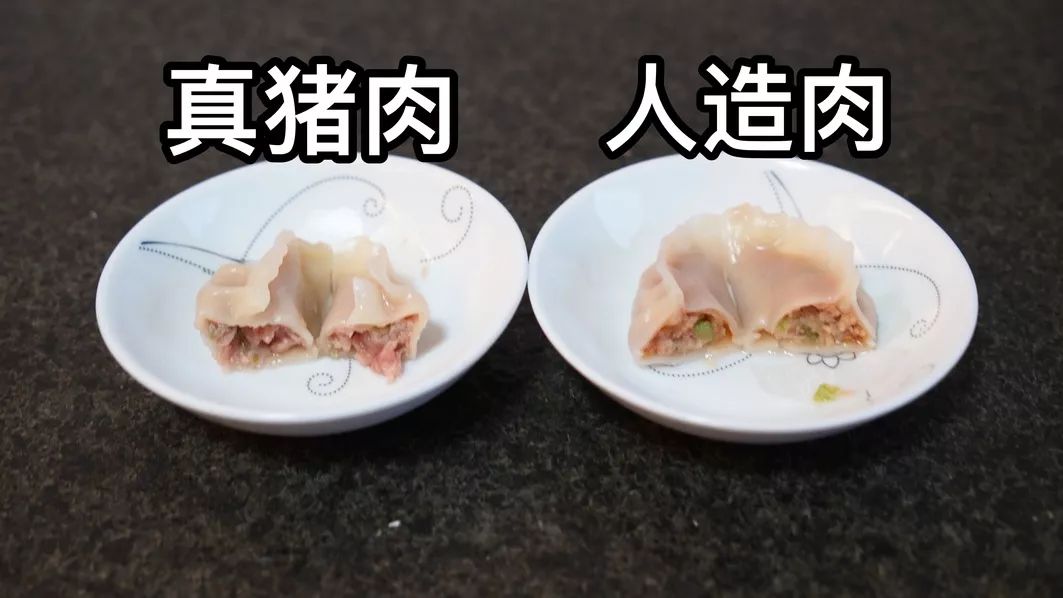 谜底揭晓,大家都猜对了,左边的饺子馅用的是人造肉,右边则是真正的猪肉。