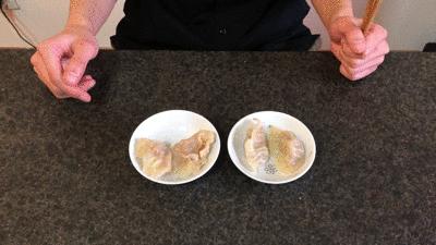 古谚有云:「饺子滚三滚,神仙站不稳」。意思就是煮饺子的过程中要在沸腾时加水止沸,沸腾三次就可以出锅了,这次人造肉和真猪肉的饺子也是按照这样的方式煮熟的。