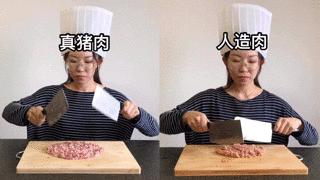 塔厨娘双刀齐下剁起馅儿来,真猪肉因为有着猪肉纤维,剁起来要稍微费点儿劲,而人造肉压根就是一摊泥,随便剁剁就稀碎稀碎。