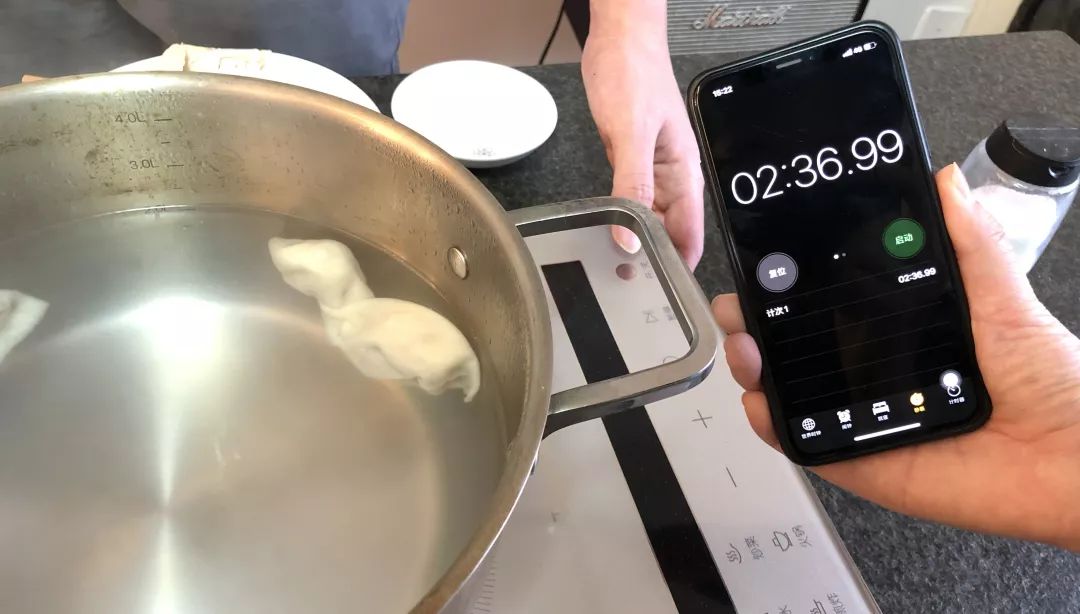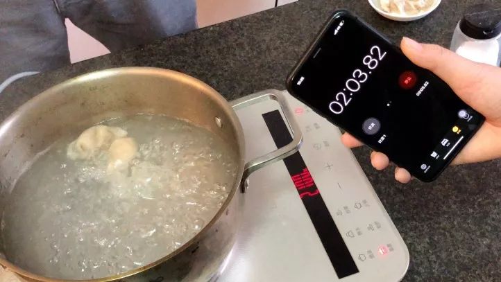 准备下锅,细心的超妹拿出手机来记录人造肉饺子和真猪肉饺子出锅所需的时长,想看看人造肉是不是比真猪肉更容易煮熟一些。
