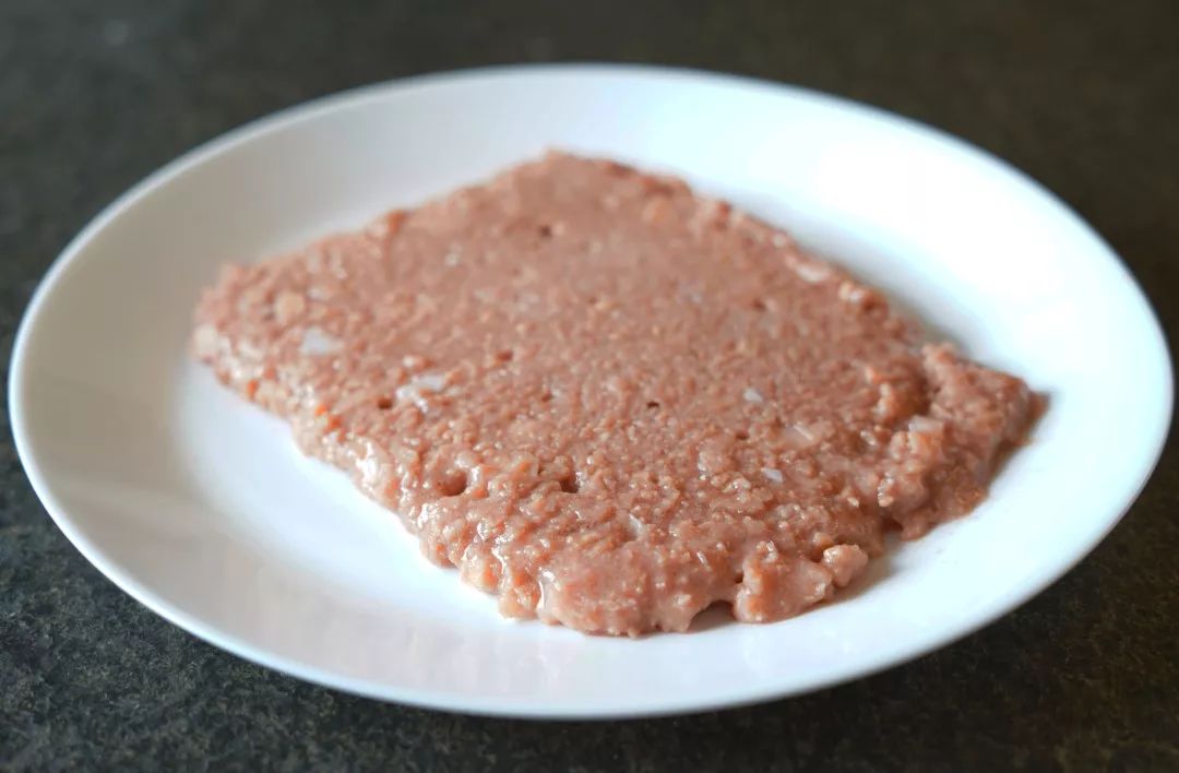 打开袋子倒到盘子里,omnipork人造肉看起来不太像肉,倒像是一摊火腿或者是午餐肉嚼碎了的样子。