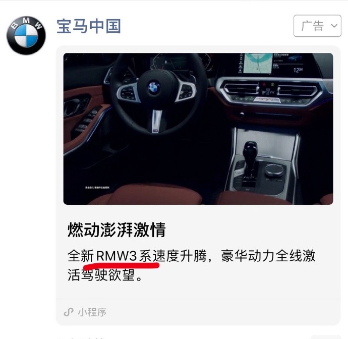 科技神回复丨宝马朋友圈广告再翻车:“RMW”3系,难道在玩错字营销?