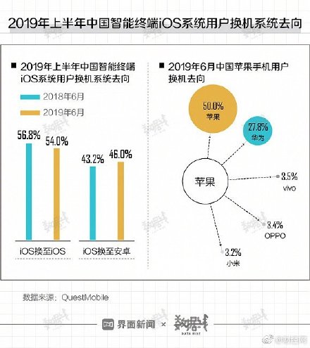 马克西姆集团的数据显示,从苹果安装用户群来看,流失率从5%上升到了9%。与此同时,苹果的流入率是7%,低于2017年的13%。在中国,数据分析公司Quest Mobile的监测数据也显示,苹果用户的忠诚度在今年有所下降。2019年上半年,约46%的iOS用户在换机时选择投入安卓阵营,这一数字比去年同期增加了2.8%。其中,27.8%的苹果用户在换机时选择了华为。