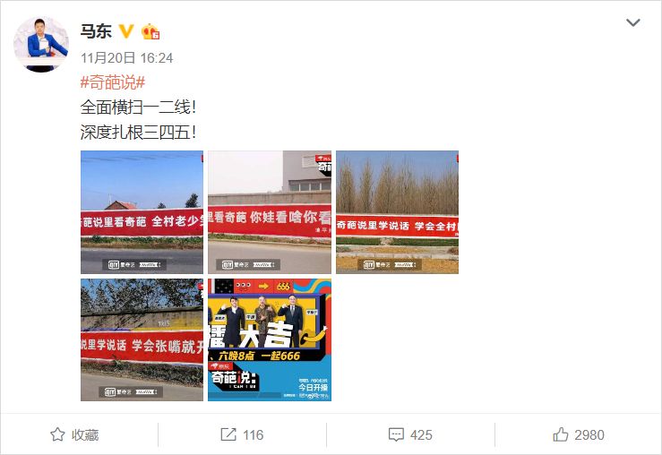比如《奇葩说》除了“全面横扫一二线”用户之外,他们还把目光转向了三四五线城市的人民,甚至还玩起了土味营销,在农村的墙上留下丝毫不输段子手的“土味”广告: