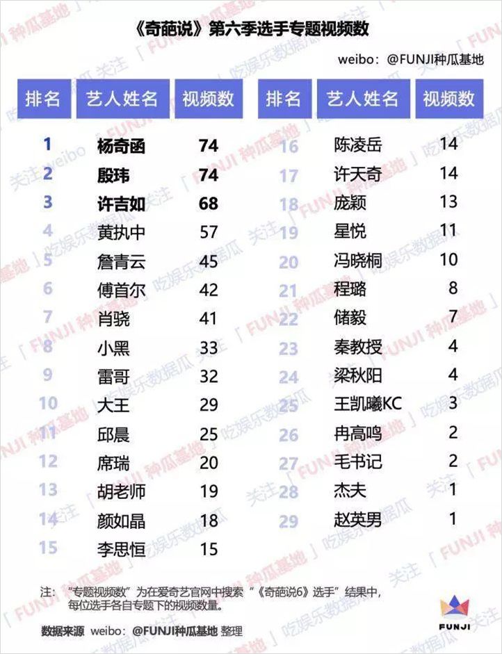 根据 FUNJI 种瓜基地整理的数据可以看到,本季个人专题视频数最多的是老奇葩杨奇函,排名第二的是新奇葩殷玮。
